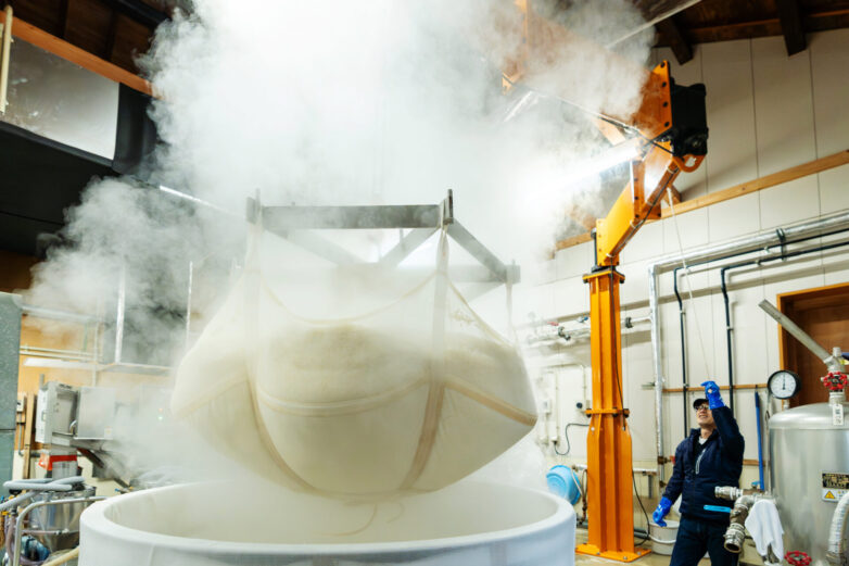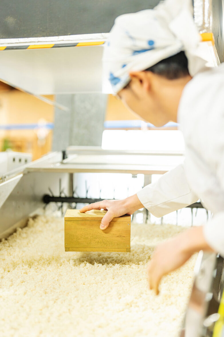 仕込みの際、タンクに投入する蒸し米の温度を何度にするかを決めて、その温度まで冷ましたお米を入れます。